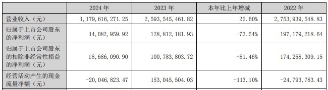 2024年,亿道信息实现营业收入31.80亿元,同比增长22.60%;归属于上市公司股东的净利润为3408.30万元,同比下降73.54%;归属于上市公司股东的扣除非经常性损益的净利润为1868.61万元,同比下降81.46%;经营活动产生的现金流量净额为-2004.68万元,上年同期为1.53亿元。